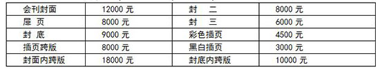 2、展會(huì)會(huì)刊:免費(fèi)刊登全部參展商名錄及企業(yè)簡(jiǎn)介。文字內(nèi)容以回執(zhí)表或郵件為準(zhǔn),會(huì)刊為32開(kāi)(規(guī)格為210mm×142mm)銅板彩印,刊登廣告采取自愿原則,收費(fèi)標(biāo)準(zhǔn)如下: